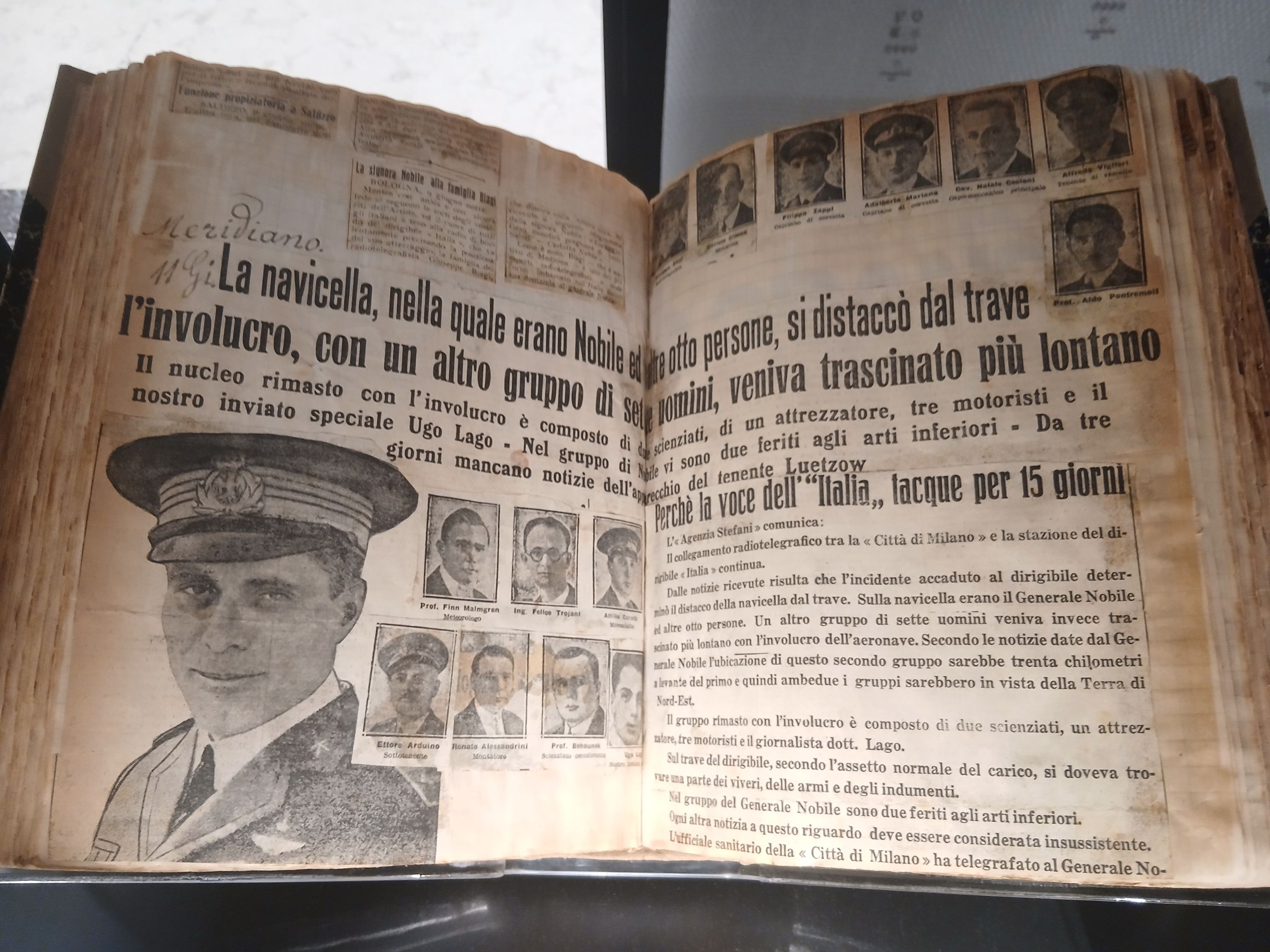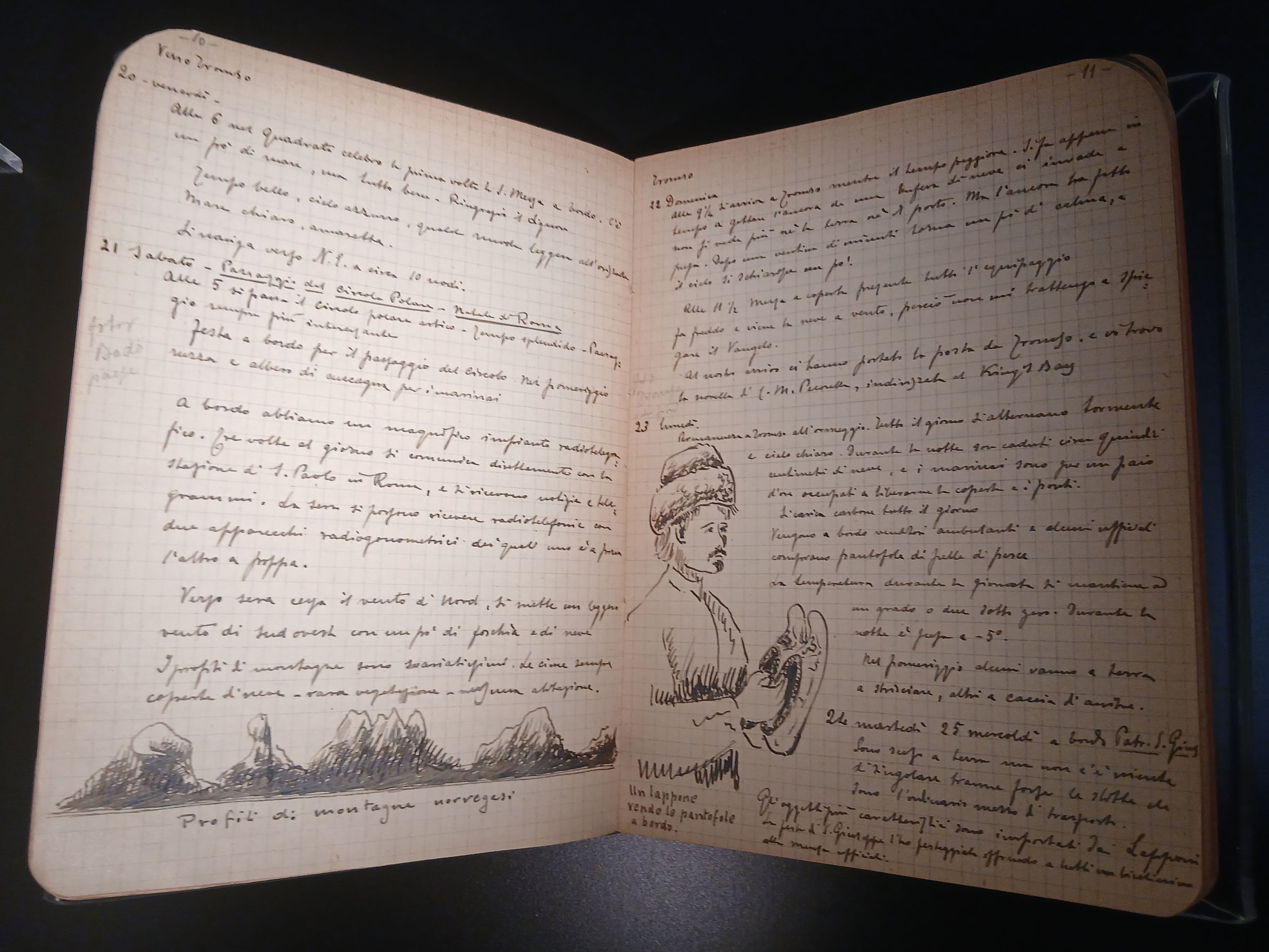 The exhibition features Gianfranceschi’s Diary Toward the North Pole—including enlarged reproductions of the many sketches that enrich it—as well as glass plate slides and a contemporary press review on Umberto Nobile’s polar expedition (1928).