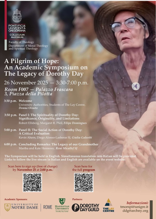 The Department of Moral Theology and Spiritual Theology, in partnership with the University of Notre Dame - Rome and Manhattan University, is proposing an Academic Symposium dedicated to assessing Dorothy Day's legacy both in terms of the meaning, originality and limits of her spirituality and the relevance of her social action.