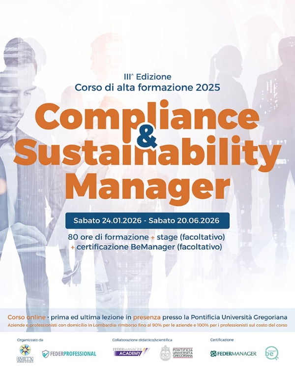 On 24 January 2026 and 20 June, the opening and closing of the course entitled: ‘Compliance and Sustainability Manager’ will be held on the premises of the Pontifical Gregorian University. The course is organised by Federprofessional and Form-Ethics in collaboration with the Mission Collegium Maximum of the Pontifical Gregorian University and Federmanager Academy. The course is entirely online, only the first and last day will be held in presence.