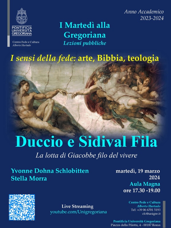 "The senses of faith" is the title of the public Lectures which, taking up a tradition of the Pontifical Gregorian University, are mainly offered to an external audience. The aim is to create a weaving between art, the Bible and theology, in the surprise that the gaze can also become a place, and not just a vehicle, in which a surprising relationship takes place that transfigures the Word.