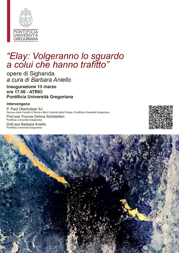 On 13 March at 5 p.m. in the central hall of the University, the inauguration of the exhibition entitled ‘Elay: They will look upon him whom they have pierced’ will take place. Works by Sighanda. The exhibition, commissioned by the Gregorian University, is curated by Professor Barbara Aniello, lecturer at the Faculty of History and Cultural Heritage of the Church. The introduction and explanation of the works will be provided by the Dean of the Faculty of History and Cultural Heritage of the Church, Fr. Oberholzer SJ, and Professor Yvonne Dhona Schlobitten, as well as the curator of the exhibition, Professor Barbara Aniello. The artist will also be present.
