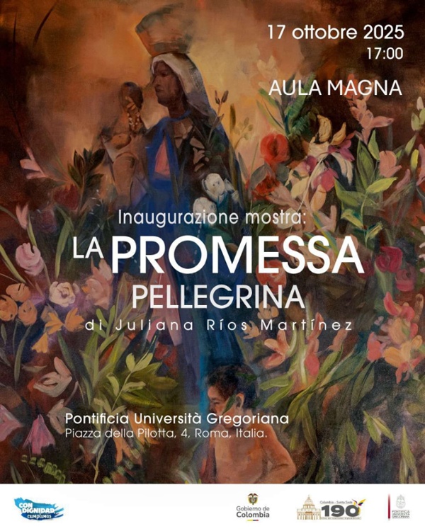 On 17 October, the inauguration of the exhibition ‘La promessa pellegrina’ (The Pilgrim's Promise) will take place in the Aula Magna of the Pontifical Gregorian University. The exhibition ‘La promessa pellegrina’ by Colombian artist Juliana Ríos Martínez will be on display at the Pontifical Gregorian University in Rome from 18 October to 12 November 2025. The exhibition is part of the commemoration of 190 years of diplomatic relations between Colombia and the Holy See and is promoted by the Embassy of Colombia to the Holy See, as part of the Cultural Diplomacy strategy of the Colombian Ministry of Foreign Affairs, and thanks to the cooperation of the Pontifical Gregorian University and the Ministry of Culture, Arts and Knowledge. Juliana Ríos Martínez's work is a manifestation of popular faith, a visual chronicle of hope and a vindication of Colombia's invisible territories. In particular, the artist depicts the procession of the Virgin of Remedies in Riohacha (La Guajira), a celebration that since the 17th century has symbolised the protection, resistance and unity of the Guajiro people. The aim is to promote a dialogue on Wayuu ancestry, colonial traces and the symbolic reparation of territories.