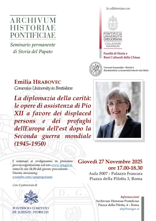 On Thursday, 27 November, at 5 p.m. in Room F007, the second event in the annual series of permanent seminars on the History of the Papacy will be held. On this occasion, Emilia Hrabovec of Comenius University in Bratislava will give a lecture entitled ‘The Diplomacy of Charity: Pius XII's Assistance to Displaced Persons and Refugees in Eastern Europe after World War II (1945-1950)’. Based on Vatican documentation recently made available for research, the scholar will reconstruct Pope Pius XII's ‘crusade of charity’ launched in the immediate post-war period in the difficult context marked by the beginning of the Cold War. A period characterised by the expansion of communism and the complex and changing attitude of the great Western powers towards the Vatican's actions, which were not without support, but also not without mistrust. In light of this, the lesson will emphasise how, in cooperation with the Allies and with local Churches, especially in overseas countries, the Holy See strove to assist and find a new homeland for the dispossessed Europeans, seeking to overcome both the justice of the victors, which excluded the defeated nations from aid, and the logic of profit, which did not accept the elderly and the weak, lacking the “muscle power” required by the host countries, into the resettlement schemes. In particular, the scholar will highlight how the Holy See was determined to offer displaced persons and refugees not only material assistance, but first and foremost religious and moral support, and to ensure, often against the incomprehension of the secular organisations involved, that refugees were accompanied by Catholic clergy of their own nationality.