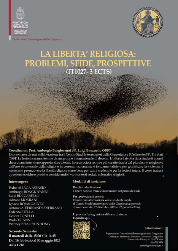 The course is the result of a collaboration between the Gregorian Centre for Interreligious Studies and the Order of the Trinitarian Fathers OSST. The lessons will be taught by an international group of lecturers. The course is open to both internal students and those who wish to explore the subject in greater depth. In a society increasingly characterised by religious pluralism and the instrumental use of religion in nationalist and fundamentalist movements and to justify violence, it is necessary to promote religious freedom as a good for all believers and for society as a whole. The course will address theoretical and practical issues considering various social, cultural and religious contexts.