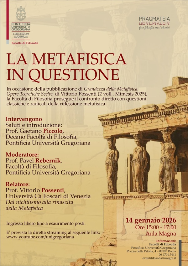 As part of the philosophical workshop PRAGMATEIA, on the occasion of the publication of Grandezza della Metafisica. Opere Teoretiche Scelte [The Greatness of Metaphysics: Selected Theoretical Works] by Vittorio Possenti (2 vol., Mimesis 2025), the faculty of philosophy continues the direct confrontation with the classical and radical questions of metaphysical reflection.