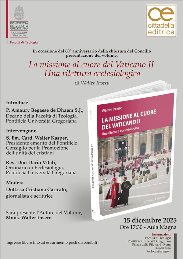 In occasione del sessantesimo anniversario della chiusura del Concilio Ecumenico Vaticano II viene presentato il volume La Missione al cuore del Vaticano II. Una rilettura ecclesiologica, di Walter Insero, pubblicato da Cittadella Editrice di Assisi nel 2025. Prendendo spunto dal contenuto del libro, l’incontro prevede un dialogo tra il cardinale teologo Walter Kasper e l’ecclesiologo don Dario Vitali, moderato dalla giornalista e scrittrice Cristiana Caricato, con l’intento di approfondire l’ermeneutica e la recezione dell’insegnamento conciliare sulla missione della Chiesa nel contesto odierno.