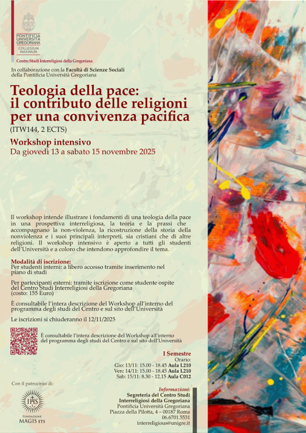 The workshop aims to illustrate the fundamentals of a theology of peace from an interreligious perspective, the theory and practice that accompany non-violence, the reconstruction of the history of non-violence and its main interpreters, both Christian and from other religions. The intensive workshop is open to all students at the University and to those who wish to explore the topic in depth.