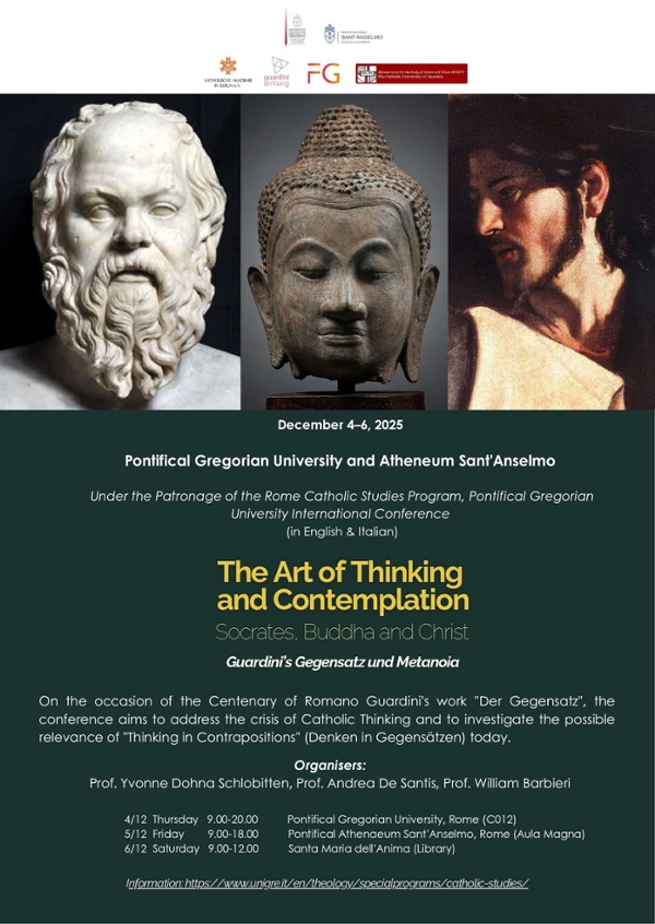 On the occasion of the centenary of Romano Guardini's work "Der Gegensatz", the conference aims to address the crisis of thinking and to investigate the possible relevance of "thinking in contrapositions" (Denken in Gegensätzen) from a theological, spiritual and interreligious perspective, as well as from a philosophical one, together with experts and students. In this work, Guardini outlines the theoretical and hermeneutic foundation of his epistemology, whereby two contrapositions (Gegensätze) constitute dynamically a tension in a space of relation. In contemplative knowledge (Anschauung), one form of knowing beyond thinking, the contrapositions, unmixed and unseparated, form a unit in tension. In his works on the great figures of thinking (Denkergestalten), he calls the exercise of thinking the ascesis of thinking (Askese des Denkens). In the context of his philosophy of the living-concrete, Guardini understands metánoia as a change of sense (Um-Sinnung). Based on his reflections, the figures of Socrates, Buddha and Christ, each of whom, in a different yet related way, represents a change of sense in life and thinking, will be evaluated as examples. The conference ends with a day of “Applied Thinking” in which the students valuate the forms of thinking in “contrapositions” in the context of their own scientific research.