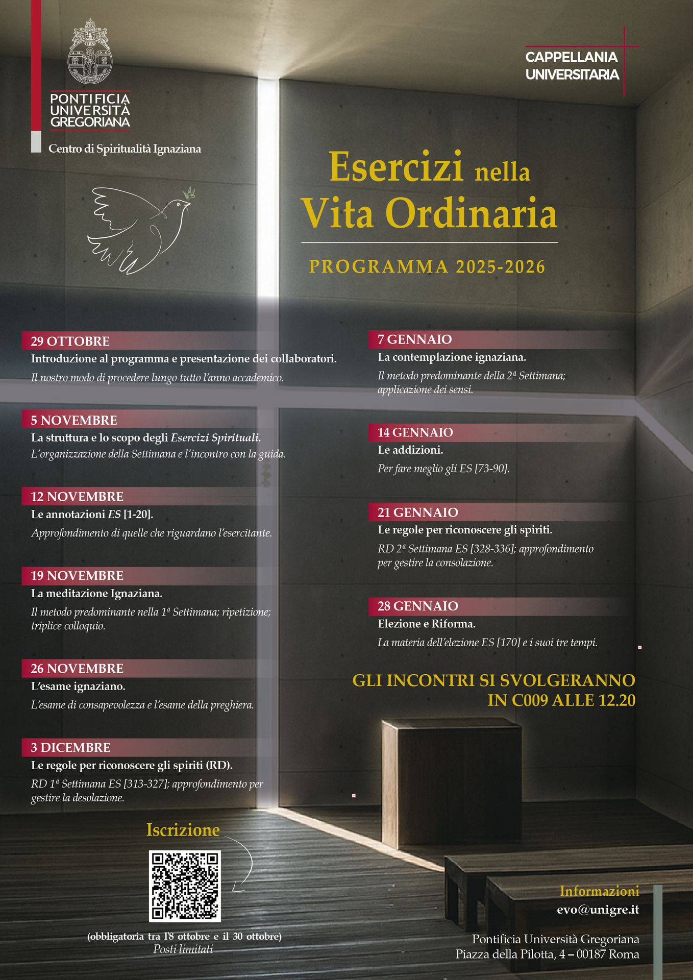 In this sense, the Exercises are not a further commitment to be set in stone among the thousand of the day: they are the daily stopover of silence, the encounter with ourselves and with God, which we profoundly need but which our own too many commitments often deny us.