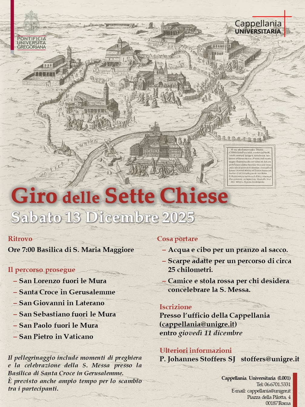 We are pleased to invite you to the Tour of the Seven Churches — Saturday, December 13! A Roman pilgrimage in the footsteps of St. Philip Neri, to pray, walk, and share. Meeting at 7:00 a.m. at St. Mary Major.