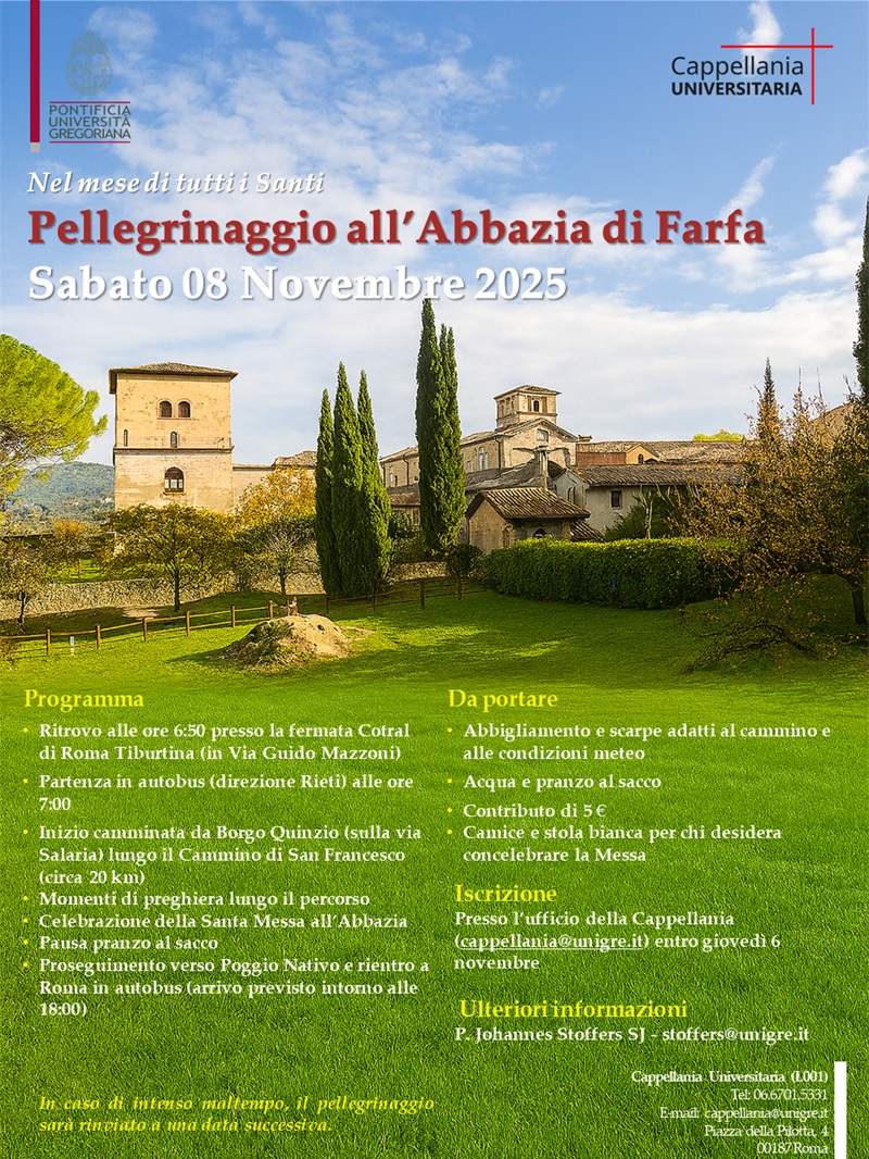 In the month of All Saints, on Saturday 8 November, the University Chaplaincy invites you to a pilgrimage to the Abbey of Farfa: a journey of prayer along the path of St Francis, surrounded by nature, silence and brotherhood. Sign up!